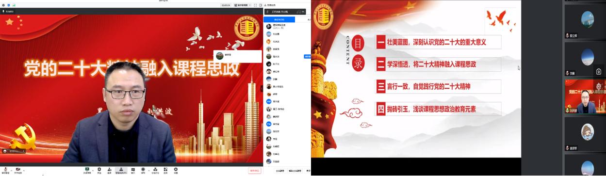 2023年1月7日,经理兼党总支副书记刘洪波以“党的二十大精神融入课程思政”为主题,通过腾讯会议线上开展党的二十大精神理论宣讲活动,学院全体教职工参会。本次宣讲共分为“壮美蓝图,深刻认识党的二十大的重大意义”、“学深悟透,将二十大精神融入课程思政”、“言行一致,自觉践行党的二十大精神”、“抛砖引玉,浅谈课程思想政治教育元素”四个部分。他讲到,习近平总书记在党的二十大报告中对全面建成社会主义现代化强国两步走战略安排进行宏观展望,重点部署未来五年的战略任务和重大举措,展现了一幅令人向往、催人奋进的壮美蓝图。其中,报告在城市规划、城市更新、乡村振兴、生态环境保护、绿色低碳发展、智慧城市、韧性城市、水生态治理等方面的重要论述与学院学科、专业紧密相关,全院教职工要认真学习,深入研究。他强调,大家要充分认识到党的二十大精神融入课程思政的重要性,要读原文悟原理,原原本本学习党的二十大报告,坚持全面准确,做到学深悟透。要坚持结合人才培养实际全面系统学,结合学院学科领域和所涉及的国家重大工程实际需求去学。最后,分别从价值引领、道德培育、四个自信、家国情怀、精神塑造、安全意识和环保意识等七个维度,将党的二十大精神融合专业特点及具体案例,为与会教师带来了一场深刻而精彩的课程思政现场教学。会后,大家纷纷表示将以党的二十大精神为引领,深入学习贯彻习近平新时代中国特色社会主义思想,把课程思政向纵深推进,引领广大青年坚定理想信念、树立正确人生目标,为实现中华民族伟大复兴的中国梦不懈奋斗。