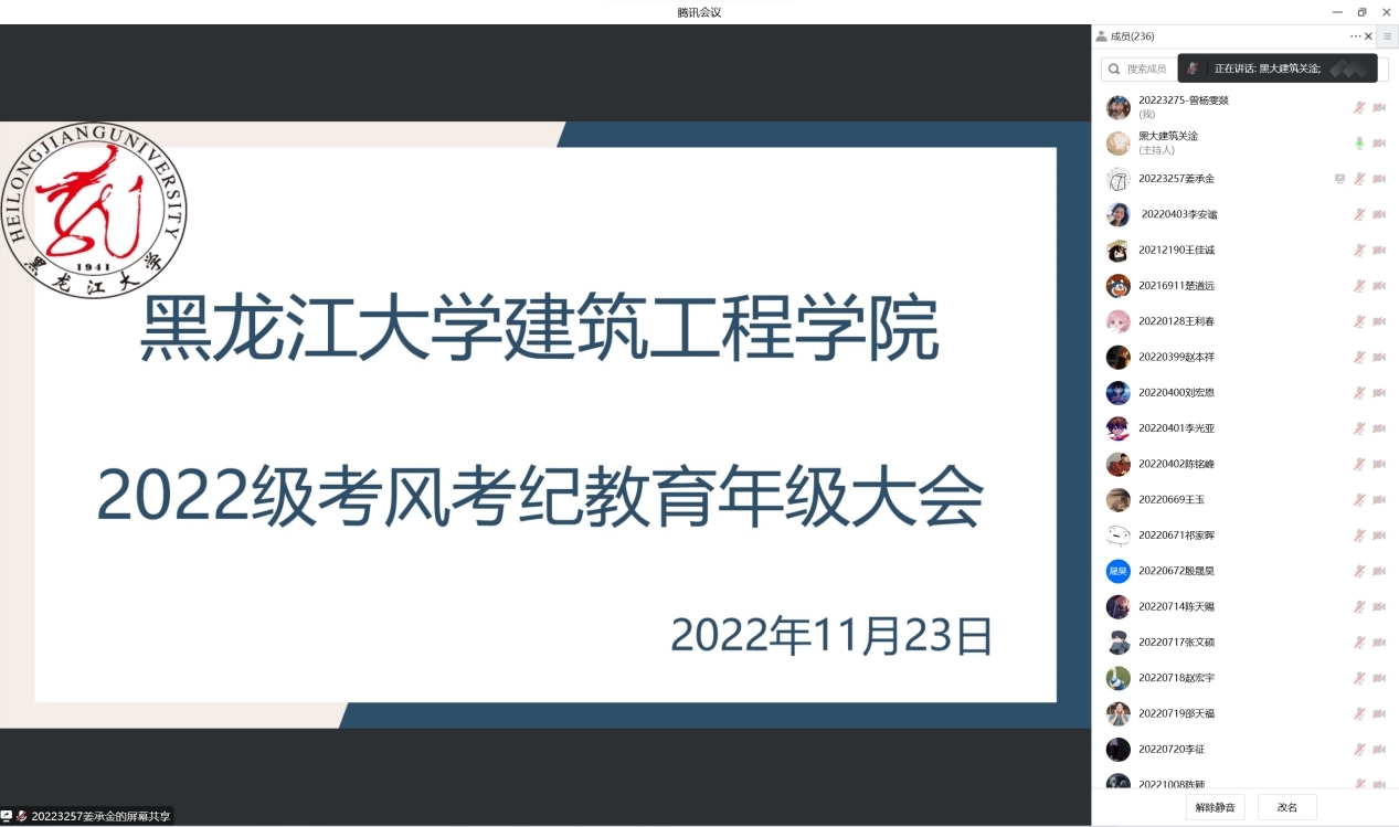 在2022-2023学年第一学期期末考试来临之际,为严肃考风考纪,弘扬优良学风,努力营造认真备考和诚信应考的浓厚氛围,建筑工程院于11月23日在腾讯会议召开2022级考风考纪教育大会。YL23455永利集团2022级辅导员关淦、2022级全体员工参加此次教育大会。