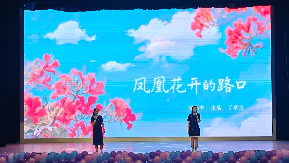 张晶老师和丁亭之同学带来的歌曲《凤凰花开的路口》,何佳泓、朱博文两位老师带来的歌曲《不要慌,太阳下山有月光》,一次次将晚会推向高潮。这两首歌曲是老师们用音符编织的祝福,他们用音乐表达出对毕业生们未来的期许和对过去的怀念,希望即将远行的学子们,能记得身后永远有母校老师们月光般温柔的牵挂与鼓励。